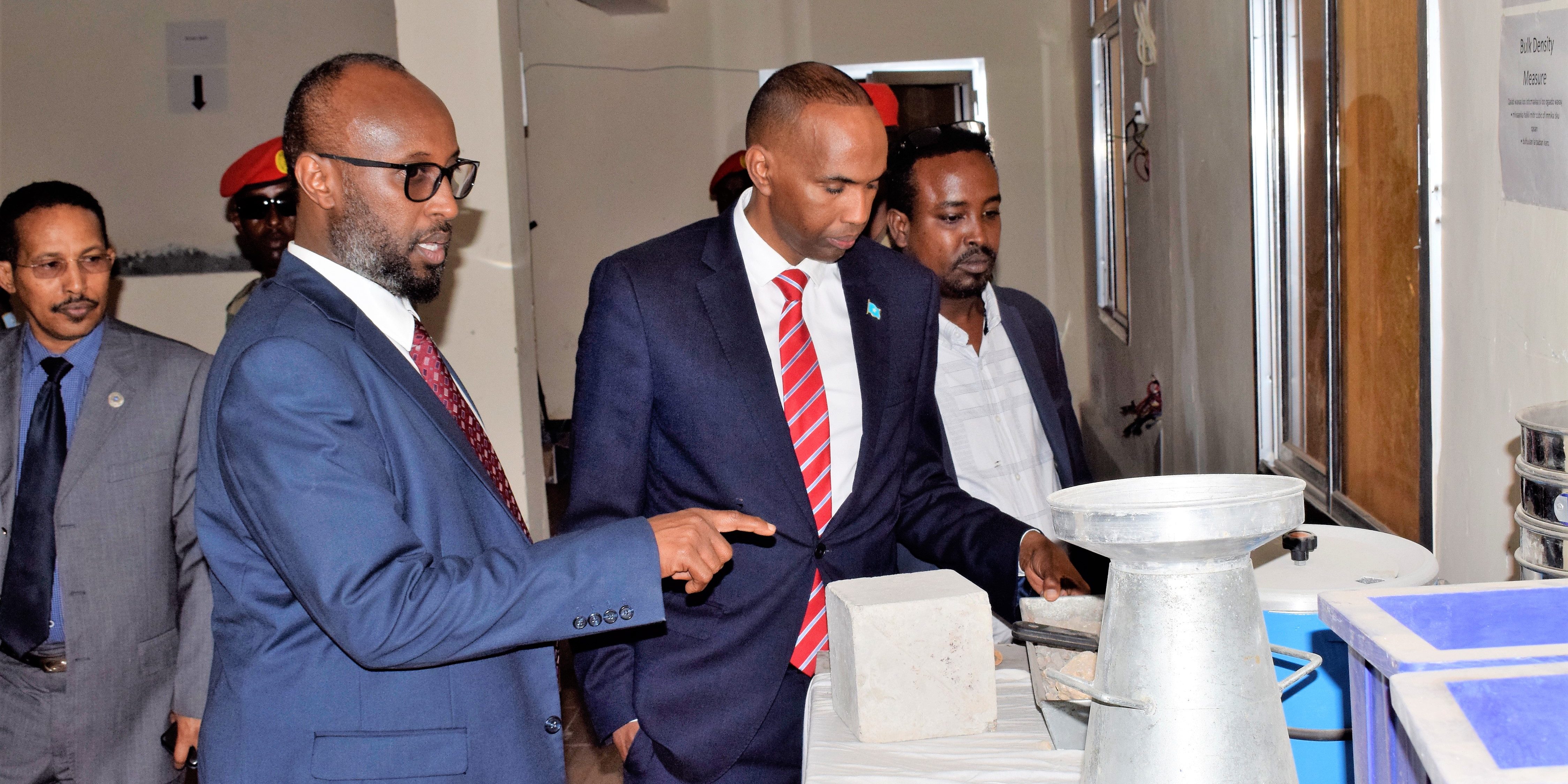 Wasiirka Wasaaradda Hawlaha Guud, Dib u Dhiska & Guriyeynta DFS Cabdifataax Maxamed Ibraahim Geesey, Wasiir Kuxigeenka Wasaaradda Jamaal Xasan Ismaaciil, Agaasimaha Guud & Hawl wadeenada Wasaaradda Ayaa Ra’isal Wasaaraha XFS Xasan Cali Khayre Kusoodhoweeyey Xarunta Wasaaradda Oo uu Kormeer Kuyimid.