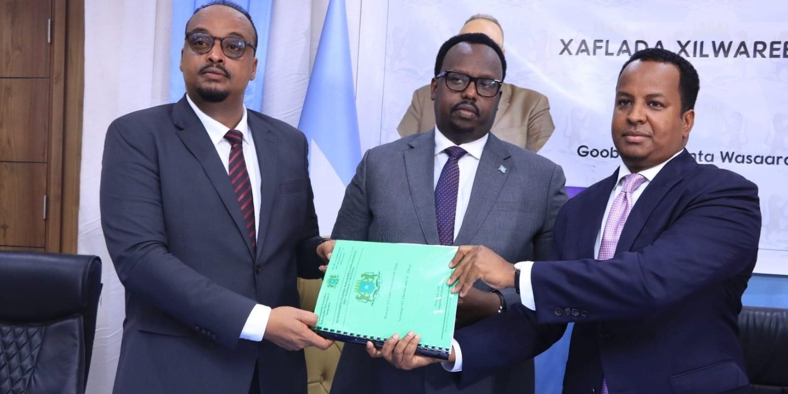 Muqdisho, February 03, 2024; Ra’isal Wasaare ku xigeenka XFS Mudane Saalax Axmed Jaamac ayaa maanta xilka u kala wareejieyey Wasiirkii hore ee Wasaaradda Hawlaha Guud, Dib u dhiska & Guriyeynta DFS Mudane Ismaaciil Cabdiraxmaan Sheikh Bashiir & Wasiirka cusub ee Wasaaradda Midane Cabdisalaan Cabdi Cali (Dhaay).