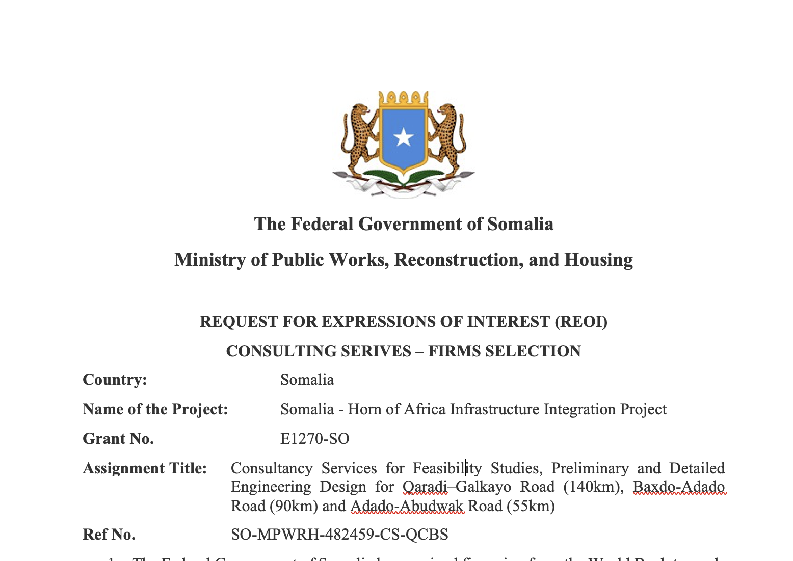 Apr272025TENDERS Galmadug_Draft_REOI_CLEAN Revised TOR-Consultancy__Feasibility_Studies_and_Engineering_Design_for_Qaradi-Galkayo_Road_(140km)_Baxdo-Adado_Road(90km)_and_Adado-Abudw(55km) Category: TENDERSBy AdminApril 27, 2025 Author: Admin Post navigationPreviousPrevious post:SOMALIA ROAD INFRASTRUCTURE PROGRAMME ADDITIONAL FINANCING (P-SO-DB0-007)NextNext post:Government Houses Situated in MogadishuRelated postsCONSULTANCY SERVICES FOR CAPACITY-BUILDING TRAININGDecember 6, 2025REOI and TOR: Consultancy Services for the Development of a Policy on Ports and Maritime TransportDecember 2, 2025REOI and TOR: Consultancy Services to Develop National Road Safety Strategy and Action PlanDecember 2, 2025REOI and TOR: Consultancy Services to Develop Standard Operating Procedures (SOPs) For Mogadishu Port in SomaliaDecember 2, 2025Consultancy Services to Develop a Policy on Accommodation of Utilities on Road ReservesOctober 1, 2025EXPRESSIONS OF INTEREST FOR INTERNET AND ELECTRICITYAugust 24, 2025